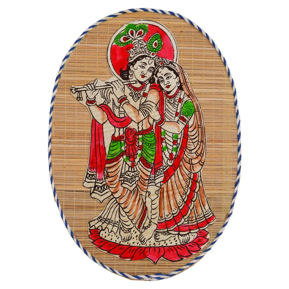 Oval Shaped Design Bamboo Hand Crafted Wall Hangings Of Krishna Ji With Radha Ji For Home Decor | Bamboo Art For Wall Decor
